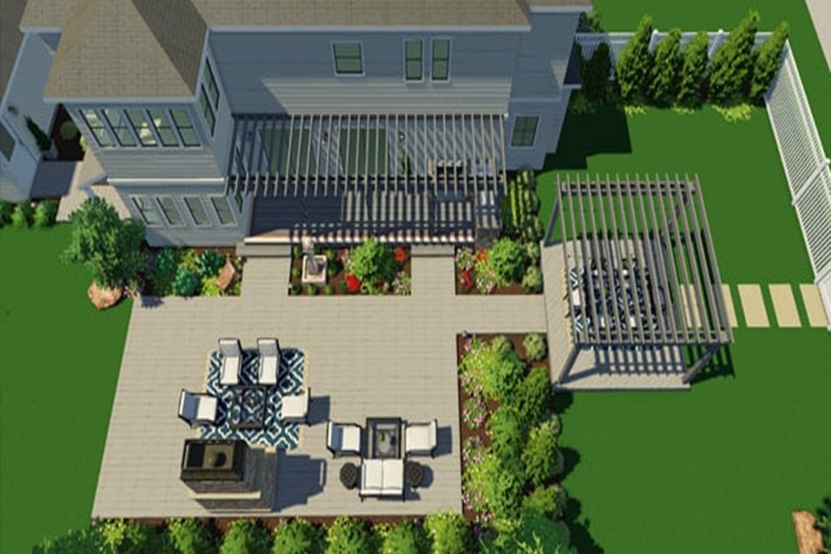 - Modern outdoor layouts including patios, decks, water features & pergolas