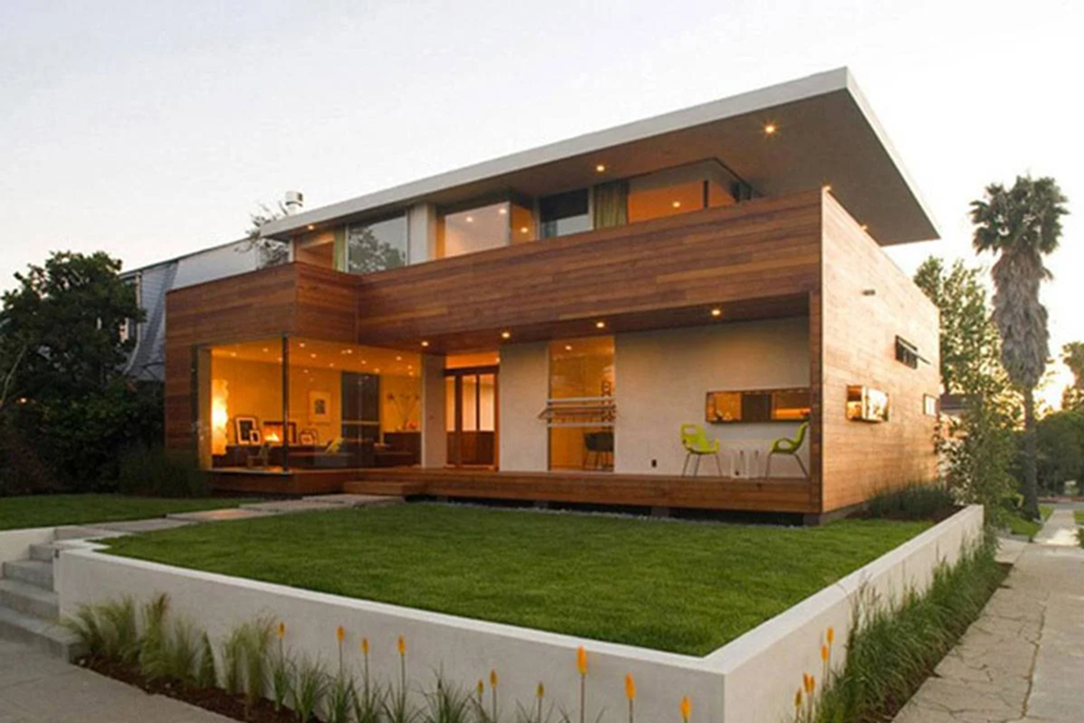 - Modern façade concepts using glass, wood, tiles, and texture elements